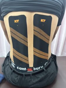 次の日にトレーニングで山ダッシュがあるという事で、施術後テーピングを施しました。今回はトレーニング後のリカバリの為にも、KTテープの温感ケアができるテーピングを使用しました。