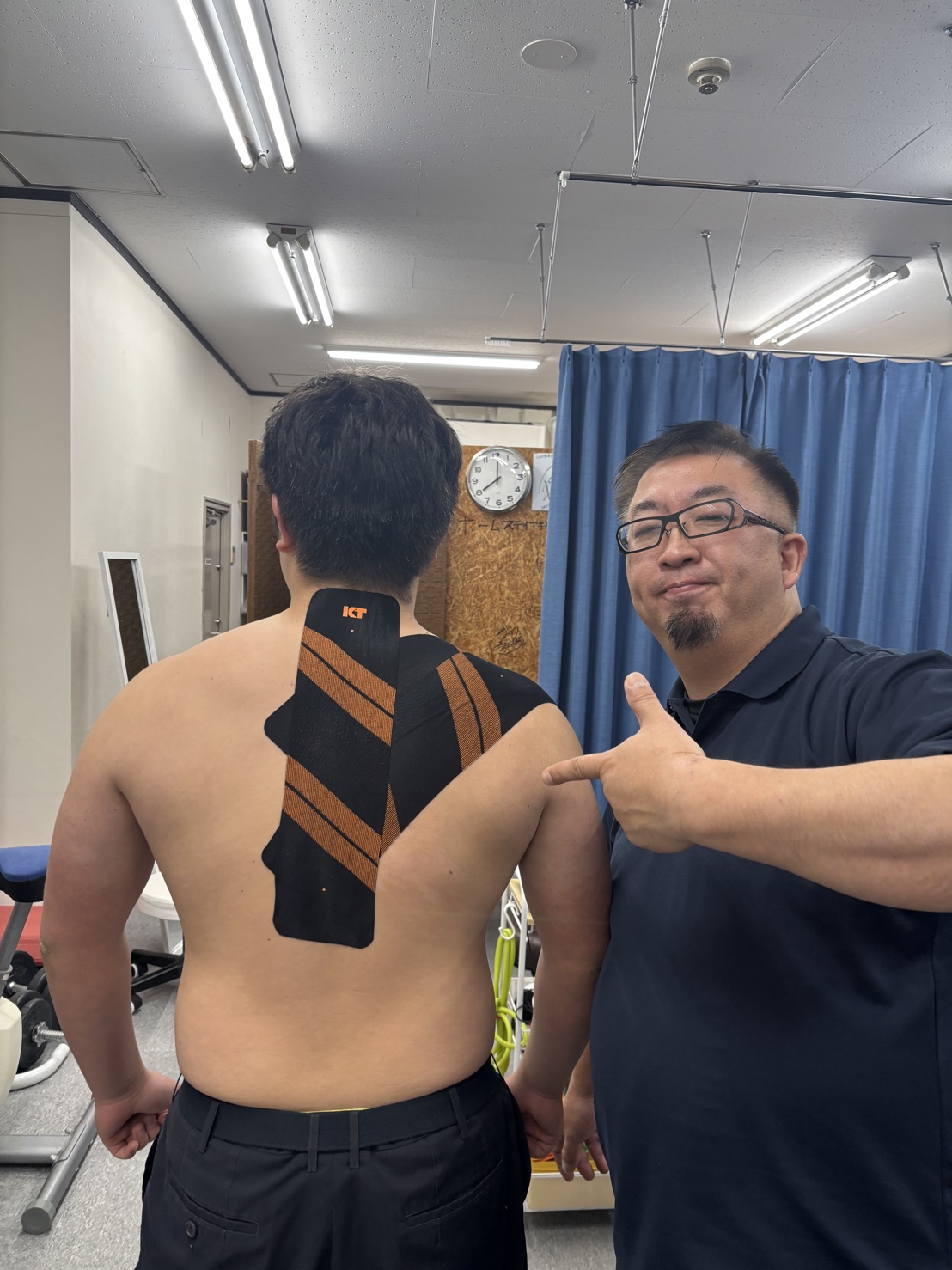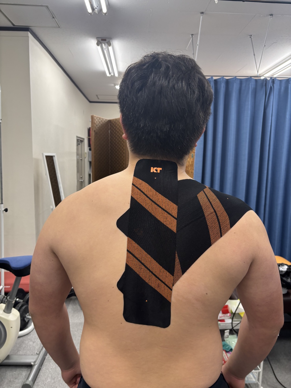 練習中、スクラムを組んで右背部に痛みが出て来院されました。急性期は過ぎていた為、手技・温熱療法をした後、次の日が練習試合でしたので、KTテープを用いて固定しました。
